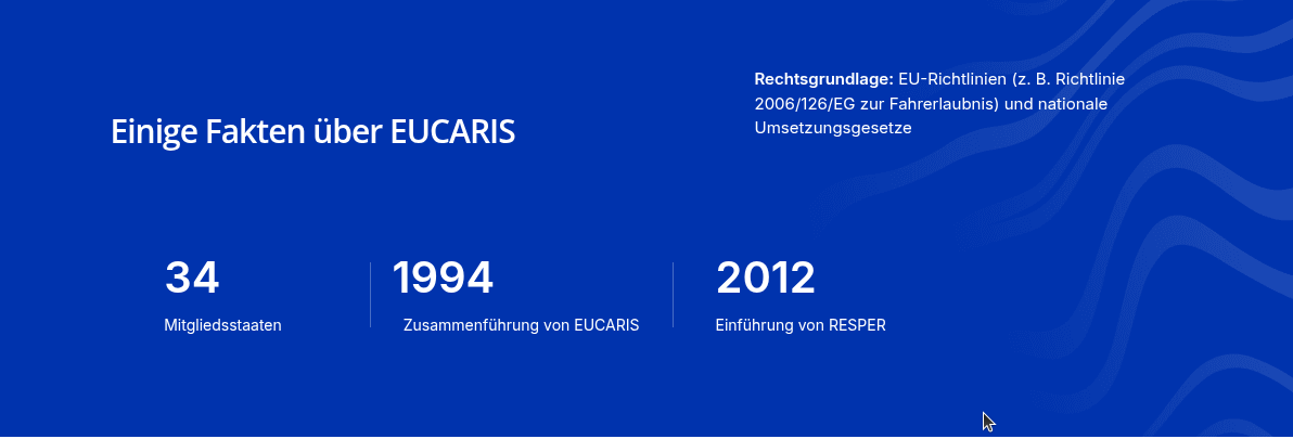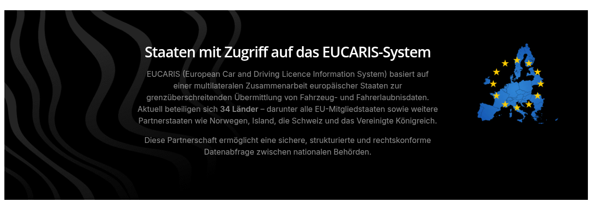 Bei EUCARIS handelt es sich um ein System für den sicheren, EU-weiten Austausch von Fahrzeug- und Fahrerlaubnisregisterdaten zwischen berechtigten öffentlichen Stellen.